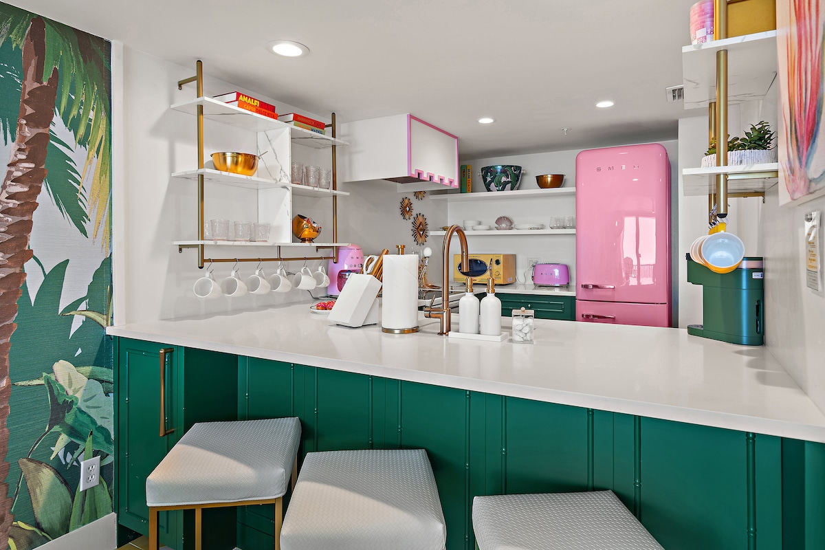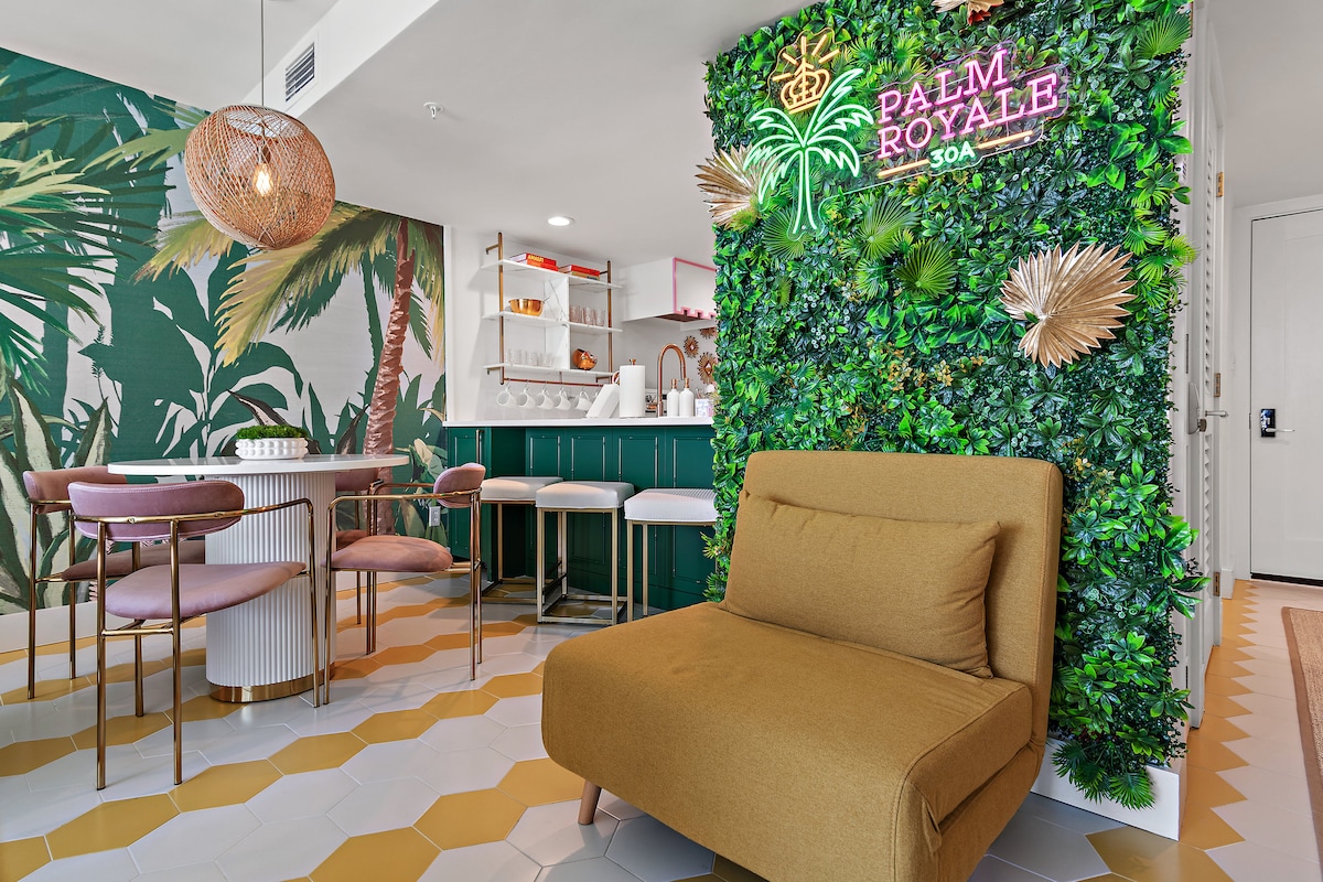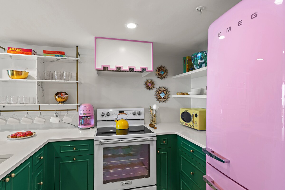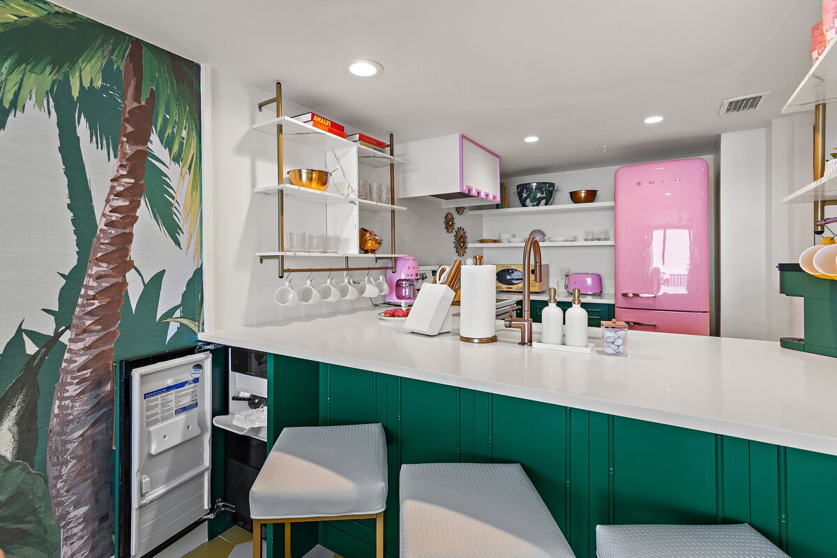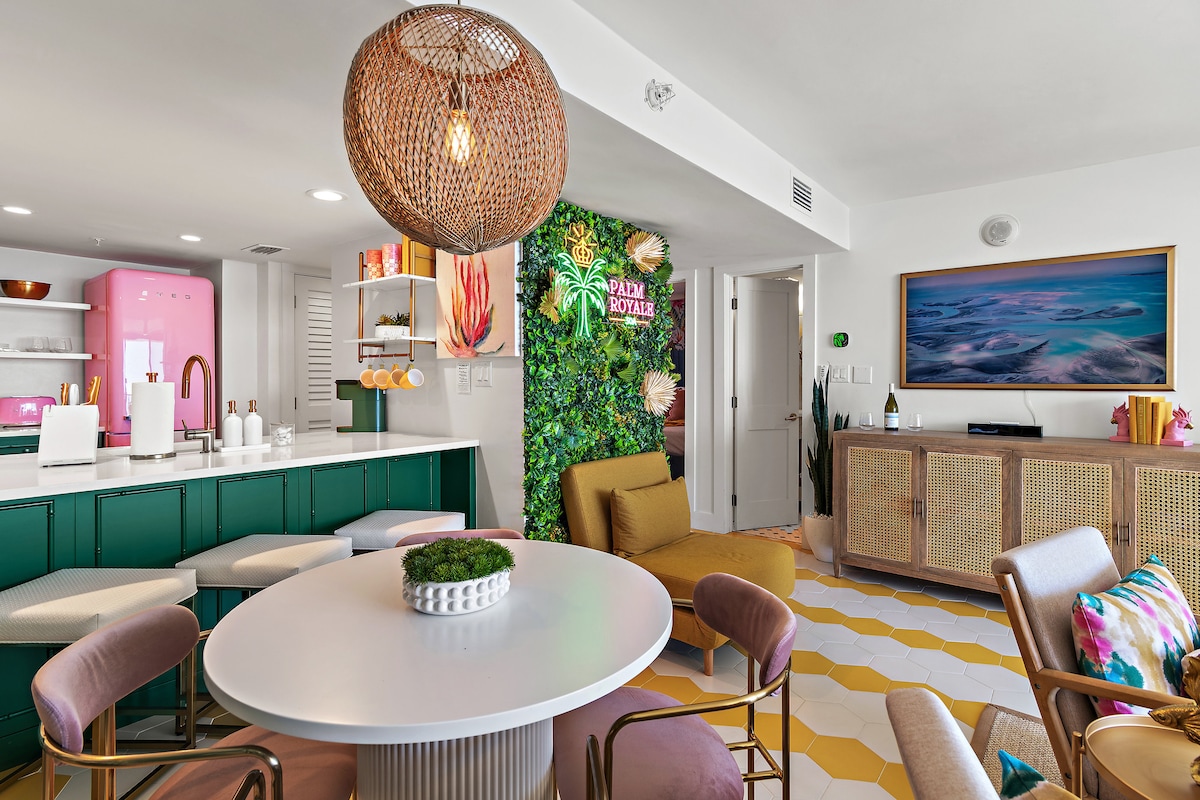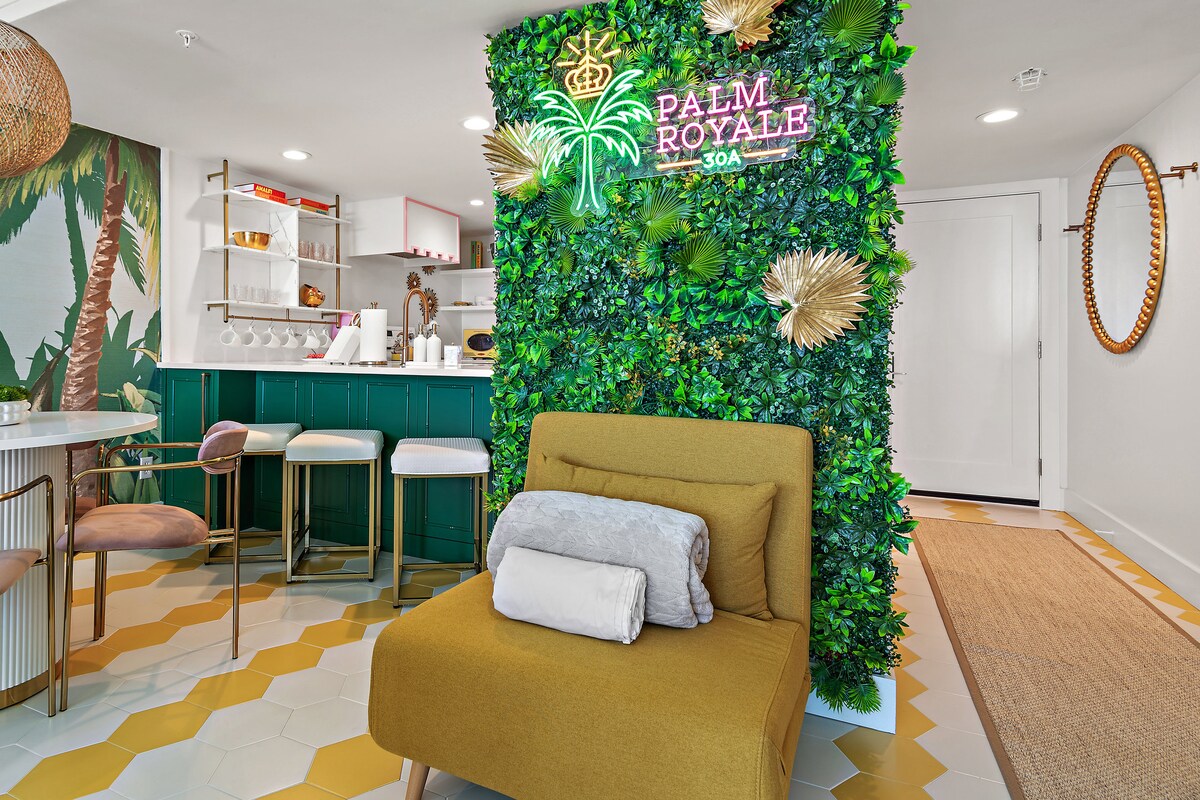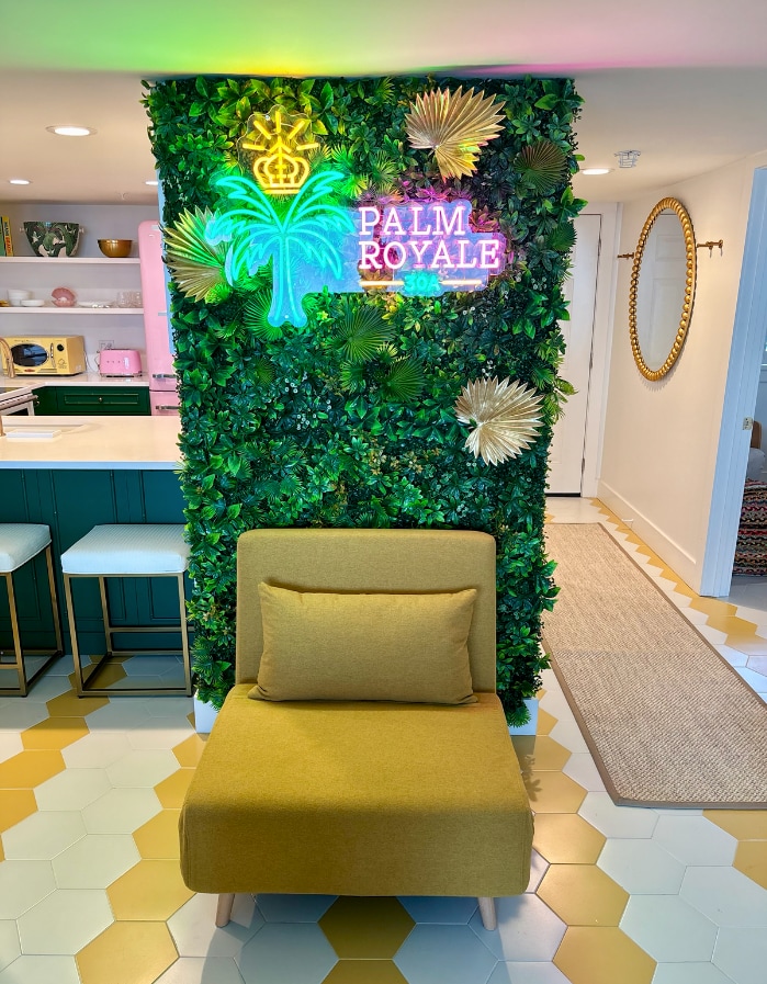 Inside, everything is brand new—from the designer furnishings and stylish lighting to the spa-inspired bathrooms and retro-modern kitchen with its iconic pink SMEG fridge. Every detail is thoughtfully curated for comfort and flair, giving you that Palm Royale “wow” moment the second you walk in.