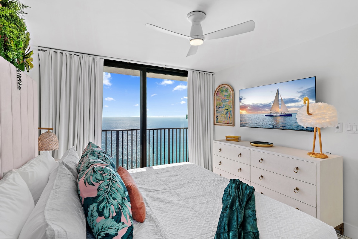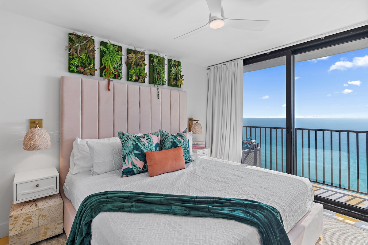 Primary Bedroom: King bed, ensuite bath, balcony access, incredible Gulf views
